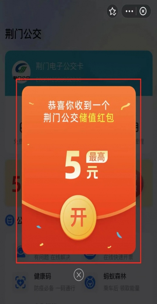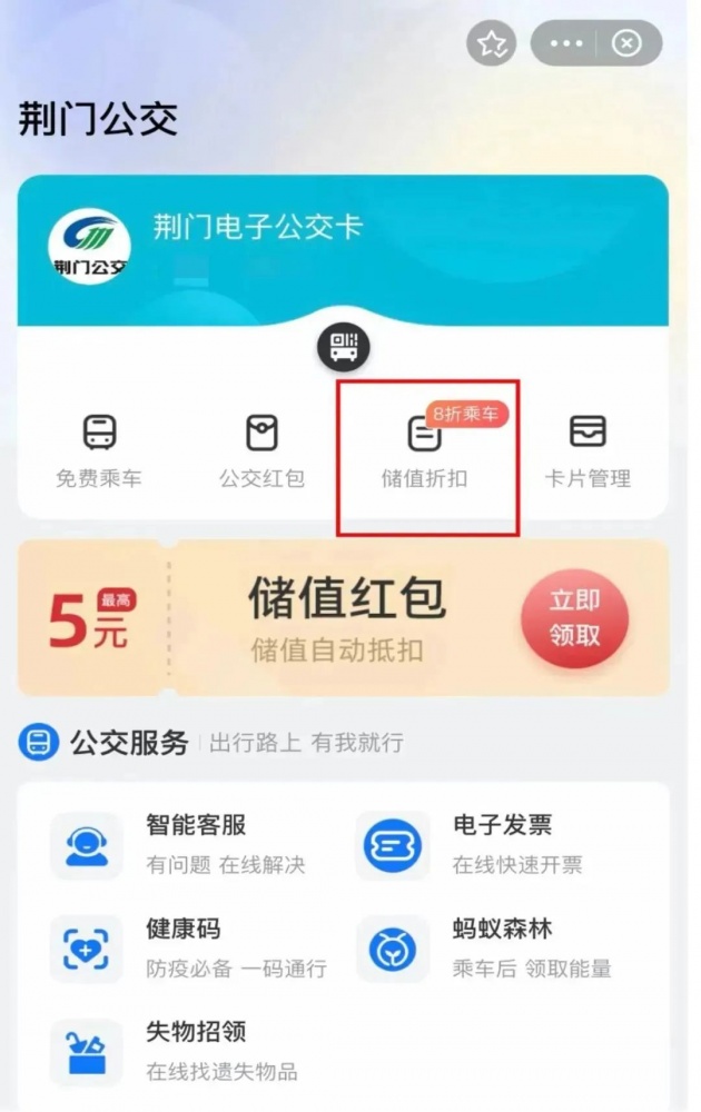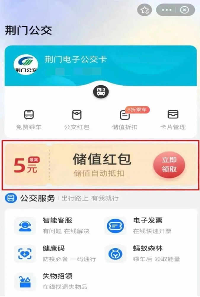 02點(diǎn)擊“荊門(mén)公交”,領(lǐng)取“儲(chǔ)值紅包"后點(diǎn)擊【去優(yōu)惠充值】,完成優(yōu)惠儲(chǔ)值