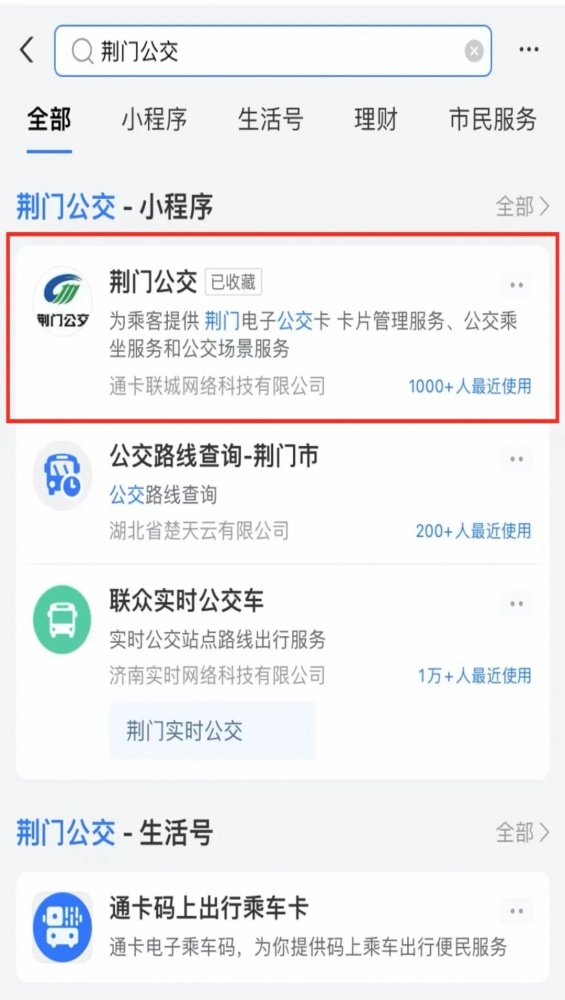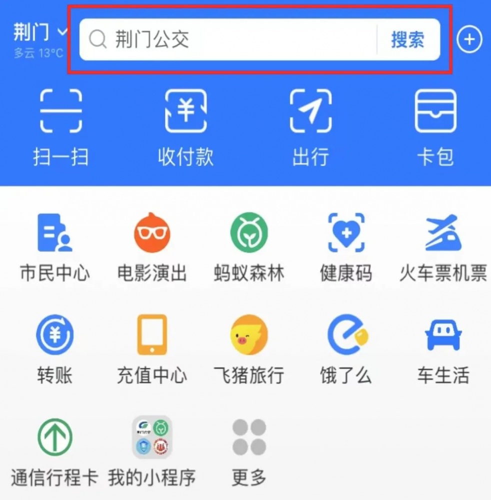 01 打開(kāi)“支付寶APP”,首頁(yè)搜【荊門(mén)公交】