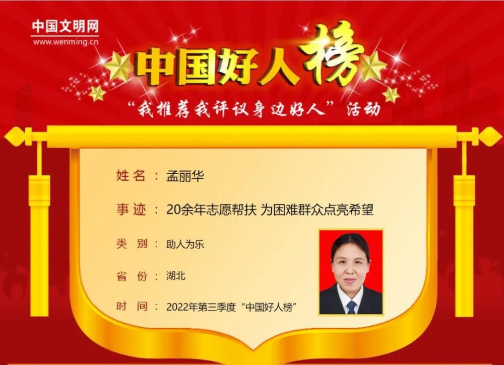 孟麗華,女,漢族,1970年生,中共黨員,荊門市公共交通集團(tuán)有限公司點(diǎn)鈔中心副主任、荊門市圓夢愛心幫扶會(huì)會(huì)長。二十多年來,孟麗華通過捐資助學(xué)、扶老助殘、幫扶貧困,將幾十多萬元工資獎(jiǎng)金和全部工余時(shí)間都用來做志愿服務(wù),把助人當(dāng)做自己的快樂和幸福,向社會(huì)傳遞著溫暖和關(guān)愛。先后獲得全國三八紅旗手、全國孝親敬老之星、湖北省五一勞動(dòng)獎(jiǎng)?wù)?、荊楚楷模、湖北省十大愛心助殘人士、崗位學(xué)雷鋒標(biāo)兵等榮譽(yù)稱號(hào)。