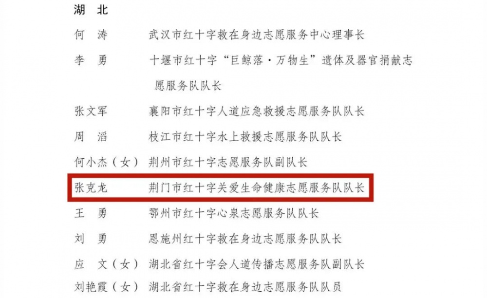 特別是3年的抗疫工作中,他一直堅守抗疫第一線,參與卡口值守、物資搬運、核酸檢測秩序維護等工作,不計得失,默默奉獻,展示了紅十字志愿者良好的風采。他先后榮獲全國無償獻血金獎、全國無償獻血志愿服務獎五星獎、全國無償獻血志愿服務獎終身榮譽獎,并先后被評為湖北省優(yōu)秀紅十字志愿者、荊門市優(yōu)秀紅十字志愿者、荊門市五星志愿者。