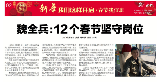 1月30日,荊門晚報(bào)頭條報(bào)道了市公交集團(tuán)10路線駕駛員魏全兵連續(xù)十二年春節(jié)堅(jiān)守崗位,受到廣大市民朋友們紛紛點(diǎn)贊。