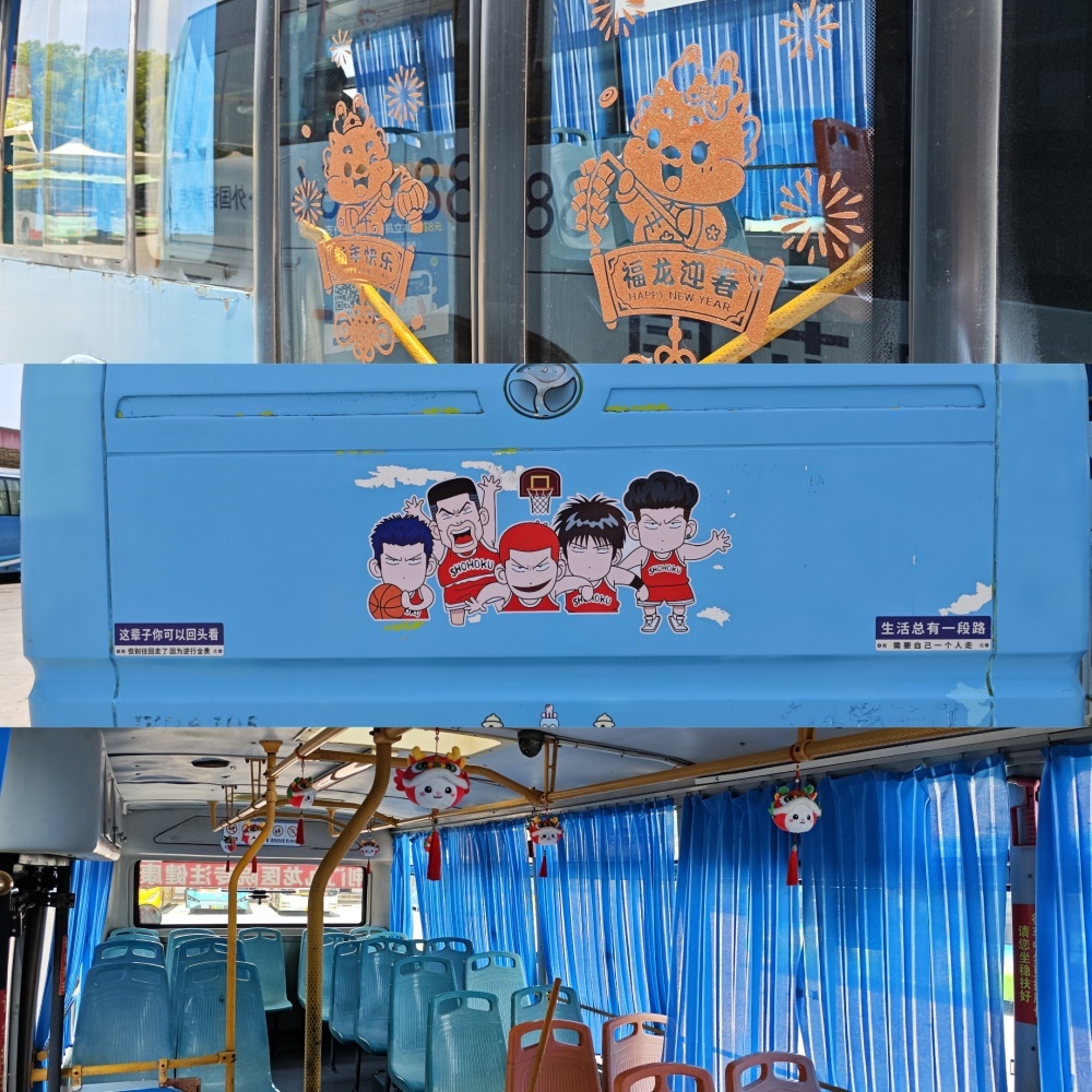 2020#車還有另外幾處細節(jié),引起小編注意,上下車門處貼有卡通人物和“福龍迎春”貼紙,車尾部貼有“灌籃高手”人物貼紙和提示標語,車廂內(nèi)的扶手桿則掛滿了喜慶娃娃??吹竭@些裝飾和布置,仿佛感受到了駕駛員的熱情、認真和細膩。