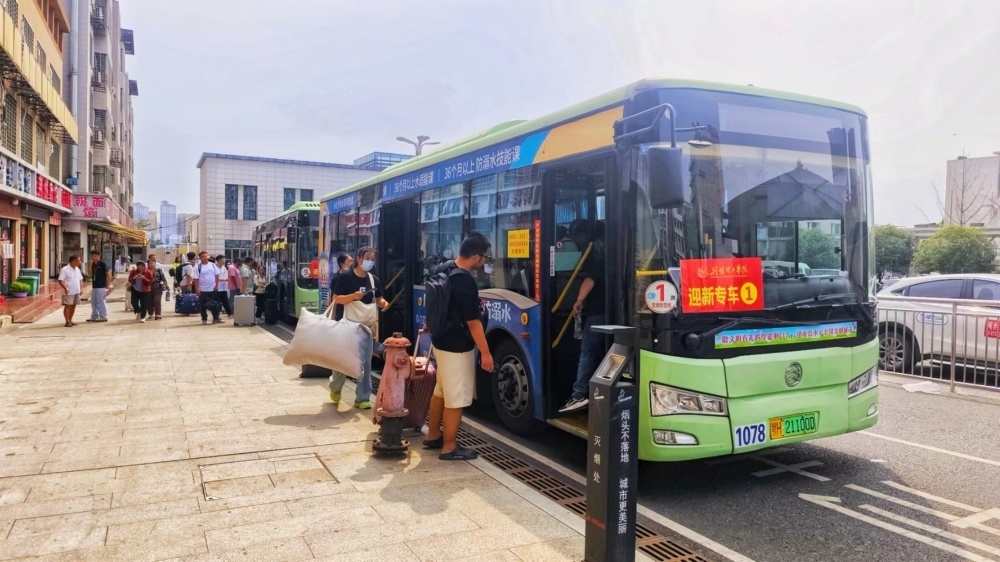 9月6日早上6點(diǎn)00分,市公交集團(tuán)將掛有“迎新專車”牌子的定制專車車隊(duì),整齊地??吭诨疖囌颈睆V場(chǎng)進(jìn)行等待。