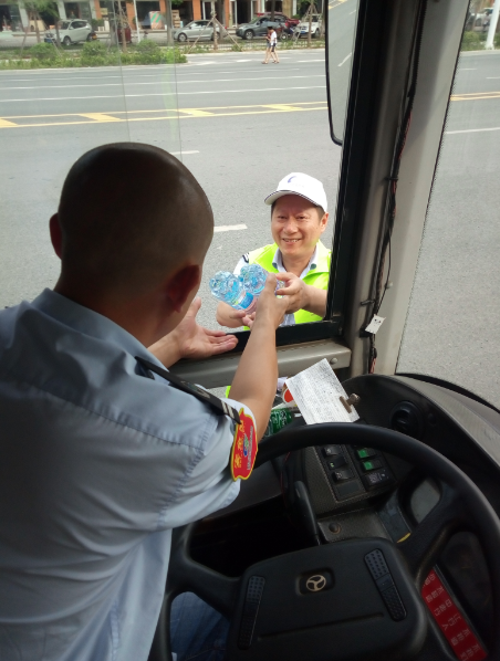 15時(shí)許,志愿者們已經(jīng)布置好了送水點(diǎn),將箱礦泉水?dāng)[在了站臺(tái)旁邊。每有一輛公交車進(jìn)站???,志愿者們都會(huì)給駕駛員們遞上兩瓶礦泉水,還有一些放暑假的小朋友們,也熱情的加入到此次活動(dòng),充當(dāng)著志愿主力軍,用他們的行動(dòng)清涼了公交駕駛員的心,傳播著社會(huì)正能量。