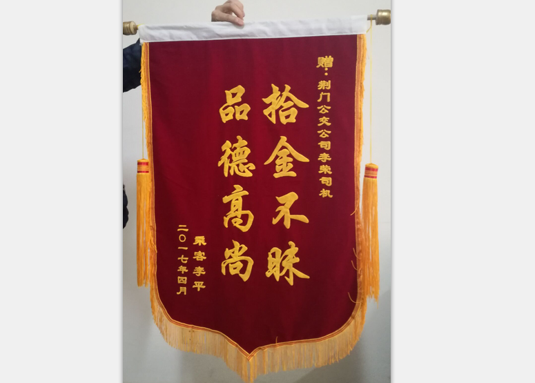 2017年4月4日上午九點(diǎn)左右,一名乘客由于粗心大意,不慎將一個(gè)包包遺留在公交車內(nèi),包包內(nèi)裝有蘋果平板電腦一個(gè)、手機(jī)一部、金銀手飾一包、銀行卡數(shù)張、身份證、現(xiàn)金若干.......二公司三路車159#駕駛員李榮在到達(dá)運(yùn)動(dòng)公園始發(fā)站打掃衛(wèi)生時(shí)發(fā)現(xiàn)了一個(gè)紅色包包,該駕駛員立馬與隊(duì)長(zhǎng)取得聯(lián)系、剛好隊(duì)長(zhǎng)和站務(wù)在始發(fā)站,駕駛員李榮親自將包交給了隊(duì)長(zhǎng),并說明原由,并在眾人下隊(duì)長(zhǎng)打開了包包,發(fā)現(xiàn)里面的都是貴重物品。不久,失主打包內(nèi)的電話來詢問此事,隊(duì)長(zhǎng)認(rèn)真做了回復(fù),告之為保證物品安全,要攜帶證明按程序認(rèn)領(lǐng)。當(dāng)天下午失主李女土從公司支部書記手中認(rèn)領(lǐng)失物。昨日送來錦旗一面。