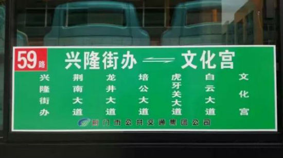 59路起于興隆街辦,止于荊門工人文化宮,全線共行駛興隆街辦、荊南大道、龍井大道、培公大道、虎牙關(guān)大道、白云大道、文化宮等主要線、點,覆蓋高新區(qū)東片區(qū)的國昊文化、華工科技等主要企業(yè),連接九派通眾創(chuàng)園、區(qū)政府、十里牌、天鵝湖、中心客運站等。早班為6:36分發(fā)班,晚上18點收班。計劃投入公交車20輛,首批投入6輛試運行。至1月20日后正式運行。