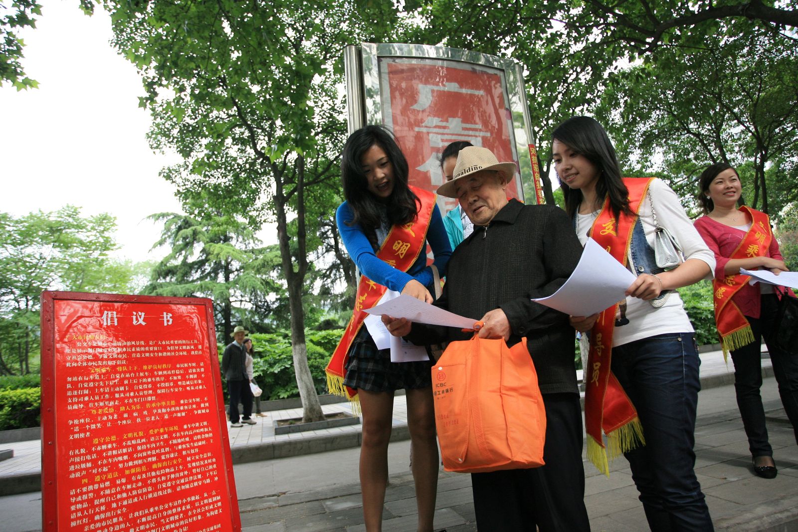 5月15日,荊門公交集團負責(zé)營運安全的3名副總經(jīng)理,帶2個營運公司20余名管理人員、以及10名身披綬帶的志愿者引導(dǎo)員在城區(qū)的一醫(yī)、中商、東方百貨、移動公司、汽車站5個公交站點正式啟動“文明進公交”活動。